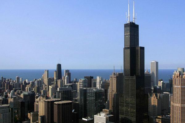 1970年建成的110層、高443m的美國芝加哥西爾斯大廈;